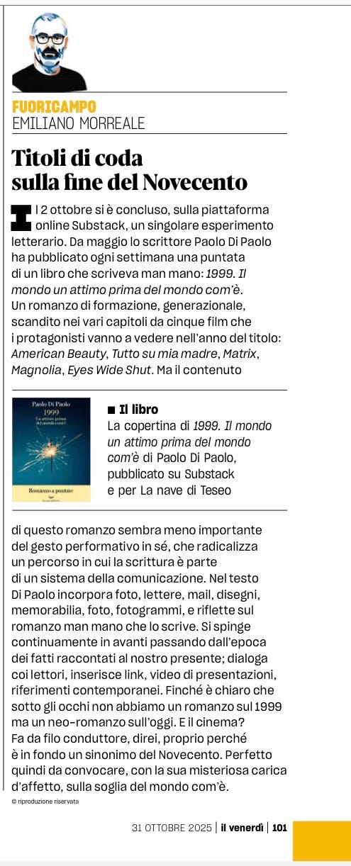Non so ancora quando uscirà in volume “1999”, ma presumibilmente nel corso del 2026. Sto ancora ragionando su come portarlo su carta arricchendo anche l’esperienza di lettura in volume. E soprattutto su come trasferire nel libro tradizionale l’elettricità del progetto nato settimana dopo settimana su questa piattaforma. Vedremo.