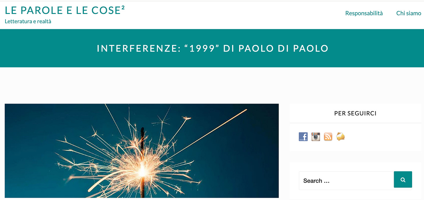 Fino a qualche settimana fa, il venerdì è stato il giorno in cui ho scritto “1999”, il romanzo a puntate. Ho stampato il file, un paio di settimane fa, e mi è sembrato incredibile che, senza quasi accorgermene, quel “libro” fosse lì, carta e inchiostro. Senza quella scadenza quasi fissa, sarebbe stato impensabile. Mi ha fatto piacere continuare a ricevere commenti e domande al riguardo: anche in diversi incontri pubblici qualcuno si è avvicinato per parlarmi di questo esperimento. Mi ha fatto piacere questa bella lettura complessiva che ha fatto una studiosa che stimo molto Thea Rimini: